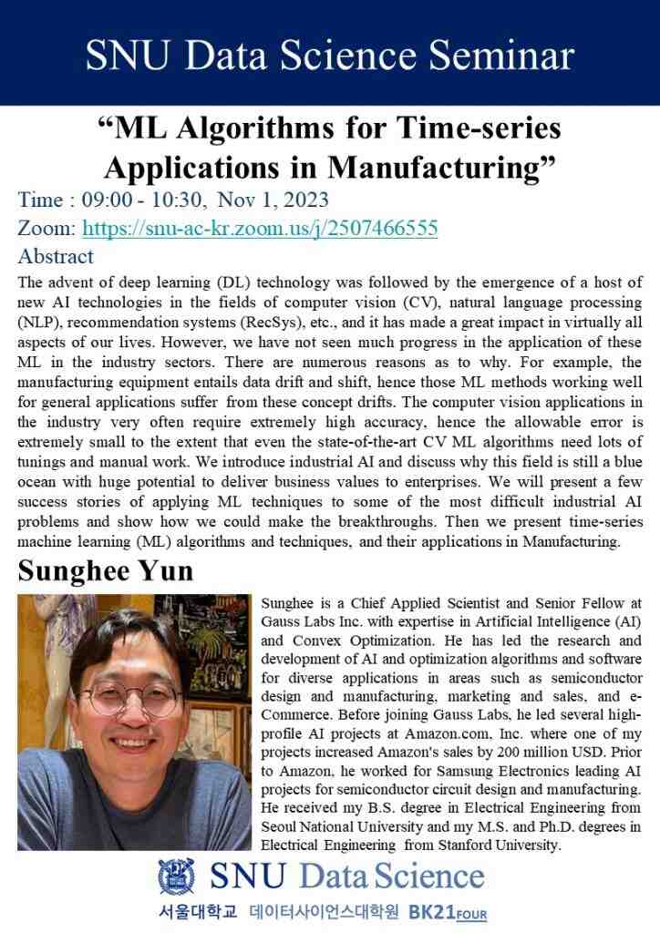 - (서울대학교 데이터사이언스 대학원 초청 세미나) Gauss Labs 윤성희 박사, ML Algorithms for Time-series Applications in Manufacturing – 서울대학교 데이터사이언스 대학원 @ 27-Oct-2023 KST