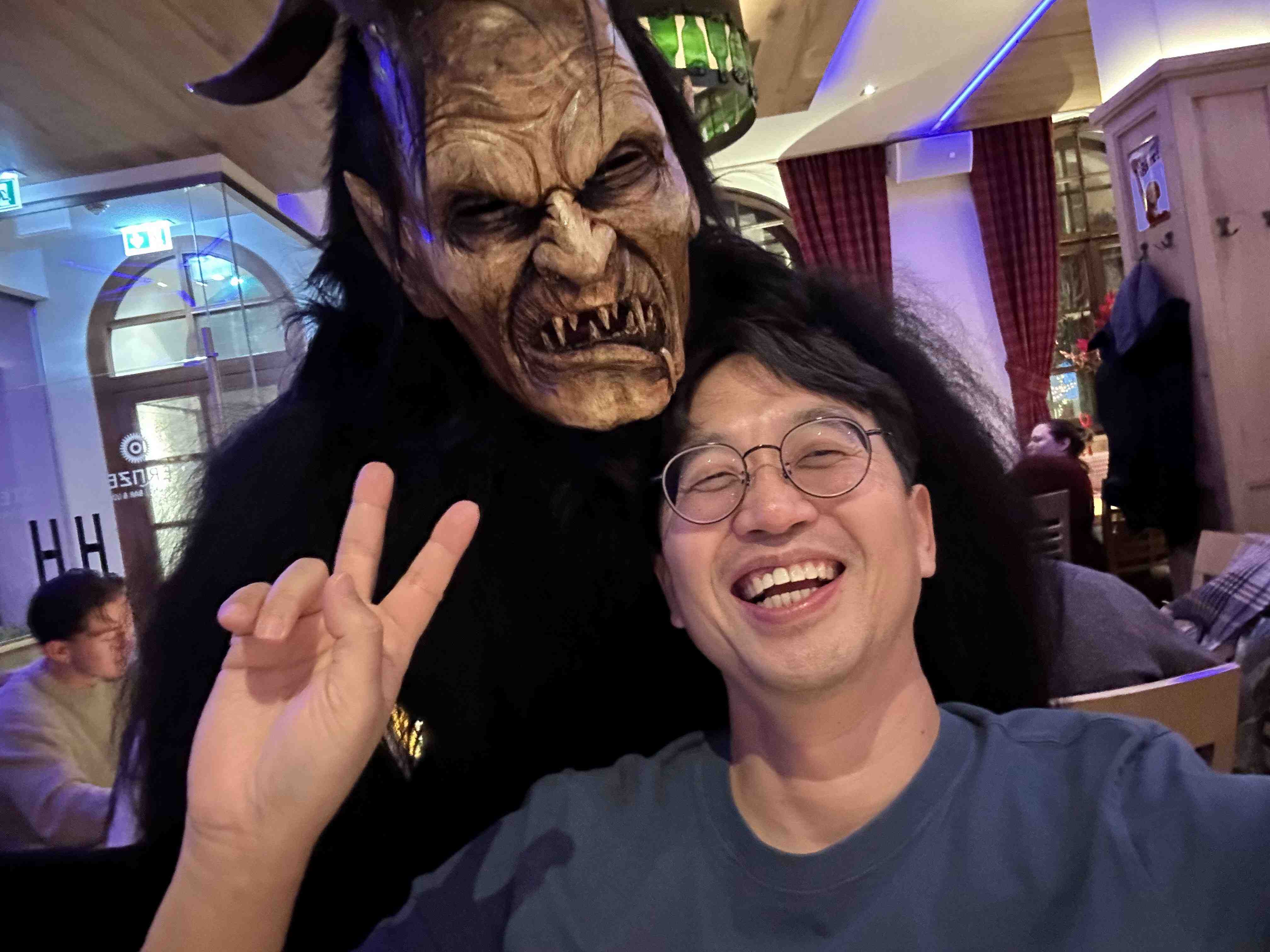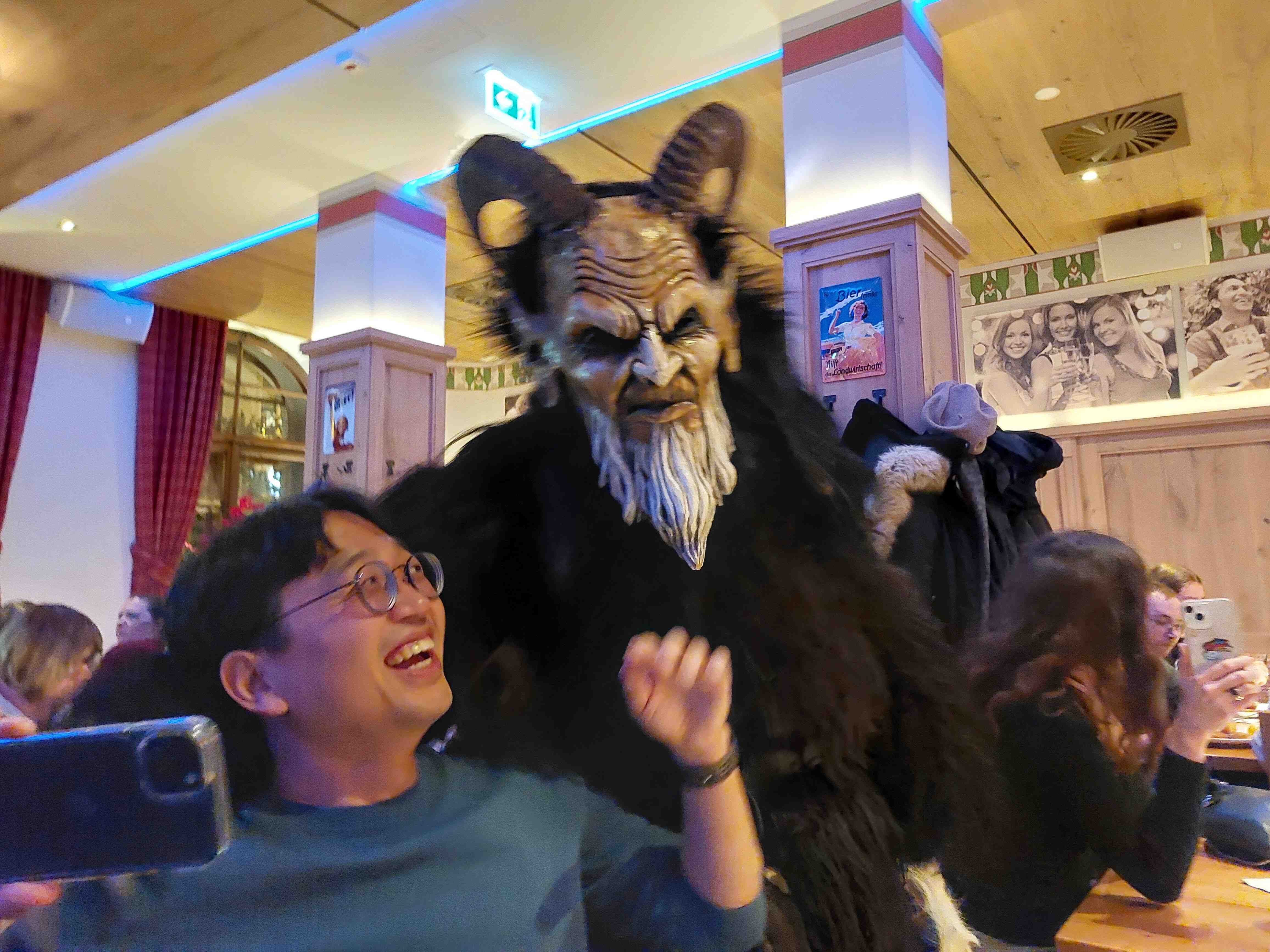 My journey concluded with a (once again unplanned, but) delightful excursion to München. The timing couldn’t have been better as I arrived during the Feast of Saint Nicholas. What awaited me was far beyond the usual tourist experience – I found myself face-to-face with a Krampus, that fearsome horned creature from Alpine folklore! Despite its terrifying appearance with sharp teeth and dark fur, the encounter turned playful, resulting in an unexpectedly joyful selfie that captured both the whimsy and the preservation of ancient traditions.