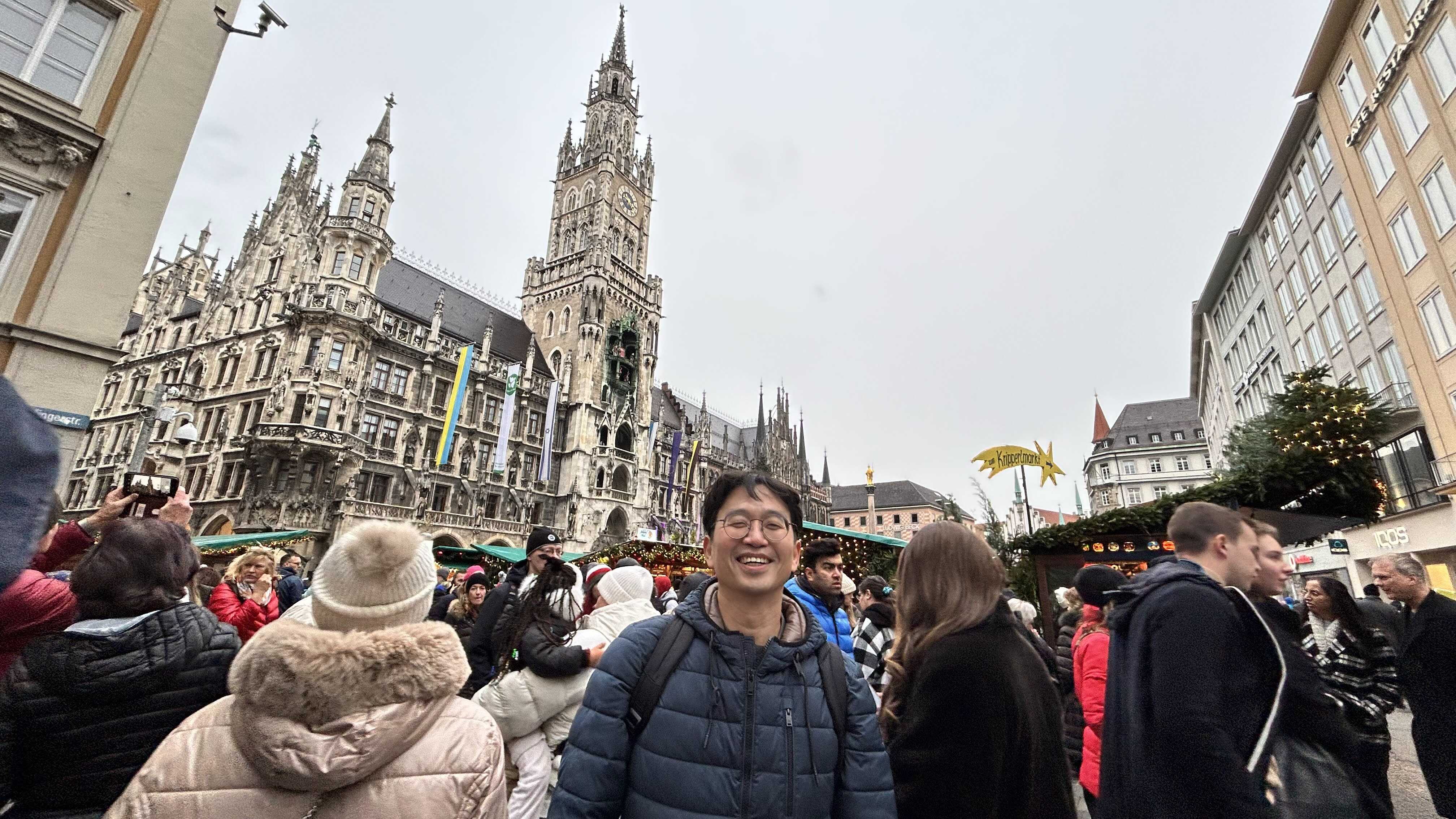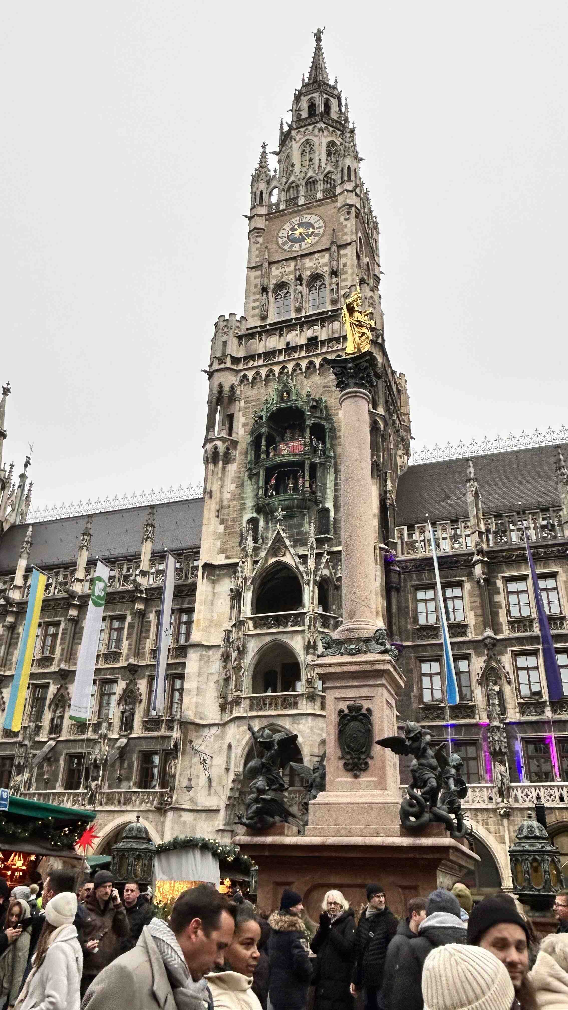 The Gothic splendor of München’s Rathaus dominated the cityscape, its spires reaching into the winter sky like a medieval dream come true. Among the crowds at Marienplatz, I found myself immersed in the Christmas market’s festive atmosphere, the ornate façade of the town hall serving as a magnificent backdrop. The Ukrainian flag draped alongside traditional decorations added a poignant touch of contemporary solidarity to this historic setting, while the famous Glockenspiel told its centuries-old stories above the bustling square.