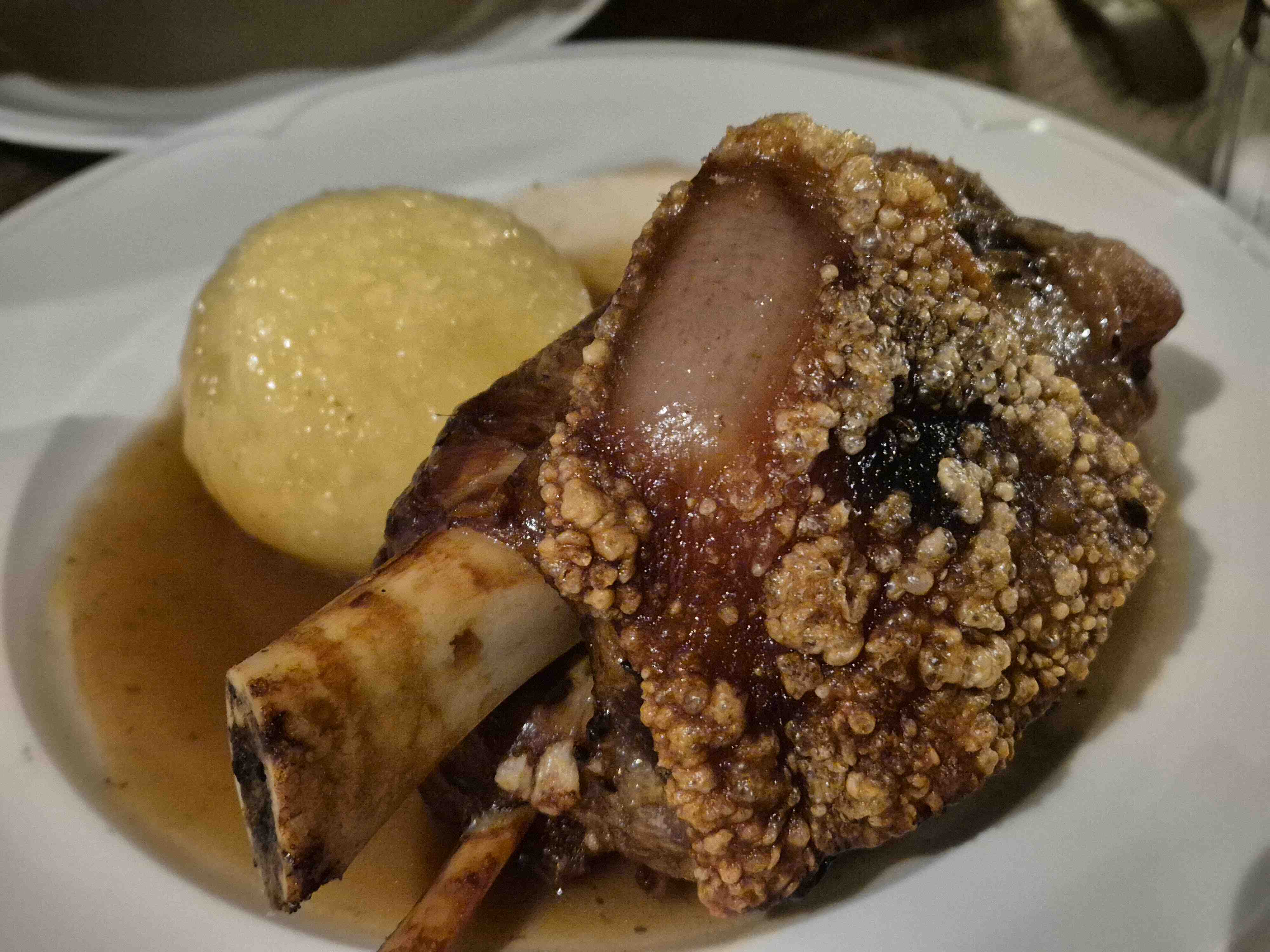 The culinary journey proved equally memorable, as I discovered authentic Bavarian hospitality in the city’s traditional beer halls. Under vaulted ceilings, I savored the simple pleasure of pristine HB Münchner beer served in traditional steins, their blue and crown logos promising centuries of brewing expertise. The crowning glory came with the Schweinshaxe – a masterfully prepared pork knuckle with perfectly crispy skin and tender meat, accompanied by a classic potato dumpling. These hearty Bavarian classics, enjoyed in the warm glow of historic establishments, provided the perfect finale to my European adventure.